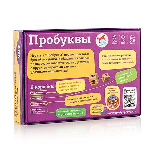 Настольная игра «Пробуквы» это отличная возможность проявить свою эрудицию и весело провести время с друзьями! Задача игроков составлять слова из букв, выпавших на брошенных кубиках. Превзойти соперников можно лишь составляя наиболее длинные слова!