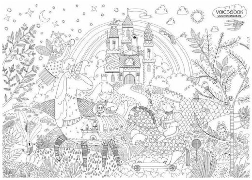 Раскрашивать такие широкоформатные полотна с обилием многочисленных занятных деталей удобнее всего на полу, так что вам нужно будет только подготовить достаточно пространства, чтобы ваши дети (а возможно и взрослые), как следует позабавились, раскрашивая наших принцесс и космических пришельцев. Детям очень нравится рассматривать детали большого рисунка и раскрашивать его. Большой формат обеспечивает эффект погружения, малыш будто находится внутри картины, и это вдохновляет его на творчество и подвиги!