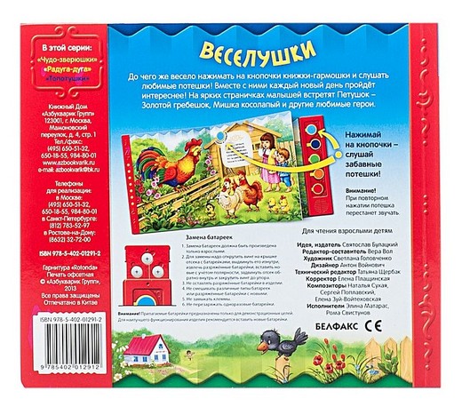 Музыкальная книга «Веселушки» оборудована звуковым модулем, что делает ее действительно интересной для детей. Когда им захочется прослушать веселую потешку, достаточно будет просто нажать на кнопку, чтобы начать воспроизведение. Книжка отличается яркими забавными иллюстрациями. Озвучена она профессиональными дикторами.
