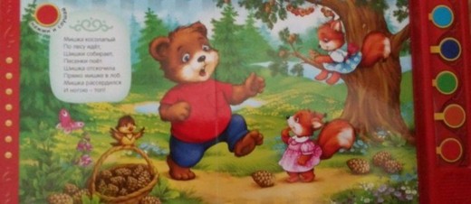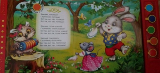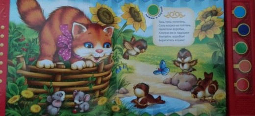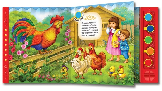 На каждом развороте напечатано по одной потешке, рядом с которой нарисован цветной кружок и точно такого же цвета кнопку можно найти на звуковой панели. При нажатии на нее, зазвучит песенка, при повторном нажатии - звучание прекращается.
