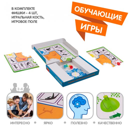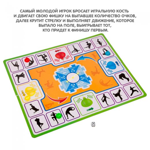 В комплект входит: игровое поле, фишка (4 штуки), игральная кость.