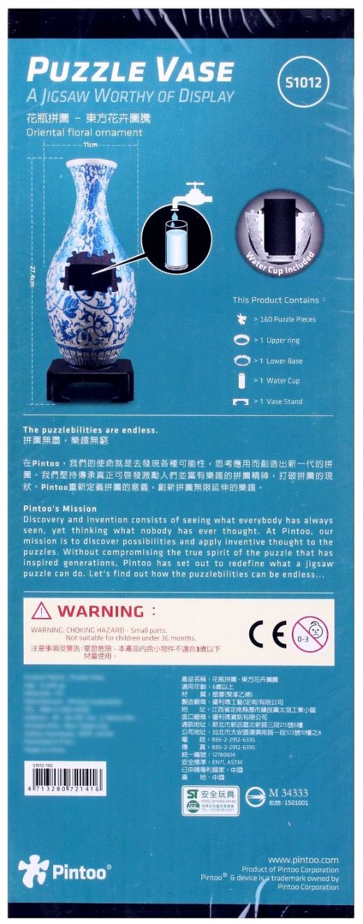Пазл-ваза с цветами, исполненная в восточном стиле, украсит собой интерьер комнаты. Представленная модель относится к новому виду пазлов, которые отличаются яркими красками, прочными элементами и хорошей сцепкой деталей. Собранную вазу будет удобно расположить на прилагаемой подставке. В 3D-вазу можно поставить срезанные цветы, для этого в комплекте есть колба для воды, которая помещается внутрь пазла. Чтобы ребенку было удобнее собирать этот красивый предмет интерьера, все элементы пазла пронумерованы со внутренней стороны.