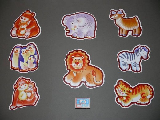 В набор Животные в зоопарке входит 8 изображений животных: пингвинов, обезьянку с детенышем, медведицу с медвежонком, слона, тигренка, льва, зебру, оленя. Игра прекрасно подходит для первого знакомства малыша с пазлами, способствует формированию навыка соединения целого изображения из двух-трёх элементов. Фигурки можно также использовать как трафарет или придумывать про них истории.