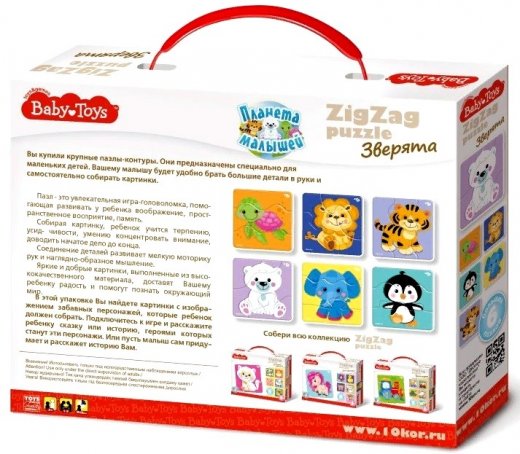 Пазлы Зиг Заг Зверята – предназначены специально для маленьких детей. Вашему малышу будет удобно брать большие детали в руки и самостоятельно собирать картинки с веселыми зверушками. Подключитесь к игре и расскажите ребенку историю с персонажами, которых он собрал. Или пусть сам малыш сочинит и расскажет свою историю, при этом правильно раскладывая пазлы.