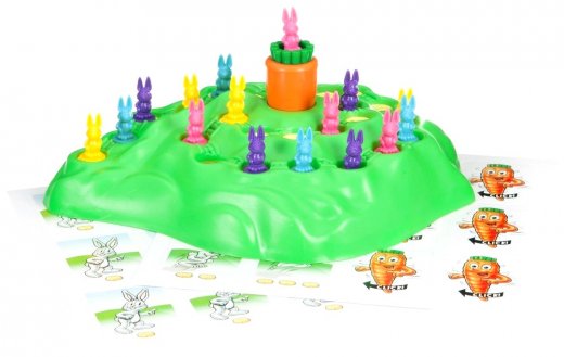 Состав: зеленый холм с вращающейся морковкой, зайцы 16 штук, карточки 24 штуки, инструкция.