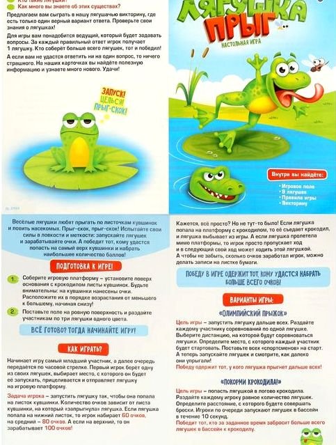 Состав: игровое поле, 9 лягушек, викторины, правила игры.