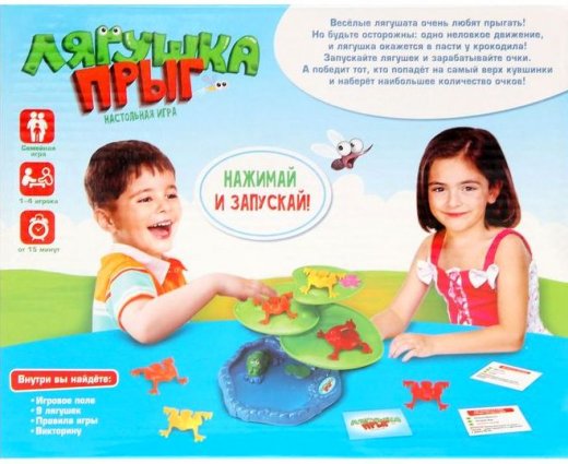 1)Прыжок: Начинает игру самый младший игрок, а далее очередь передавайте по часовой стрелке. Первый игрок берет одну из своих лягушек, выбирает место, с которого он будет ее запускать, прицеливается и отправляет лягушку на игровую платформу. Запустить нужно так, чтобы она попала на листок кувшинки. Количество очков зависит от листа, на который приземлилась лягушка. Нижний 60, средний 80, а самый верхний 100 очков. Если лягушка попадет на платформу с крокодилом, то он ее съедает и игрок выбывает из игры, если лягушка пролетела мимо платформы, то игрок пропускает ход. Победит тот, кто больше всех наберет очков.