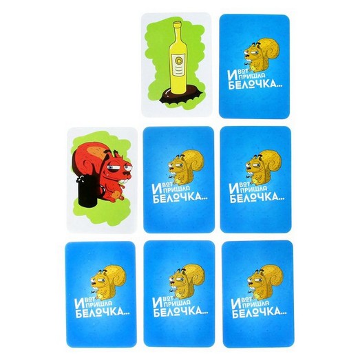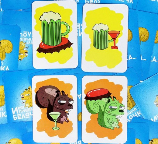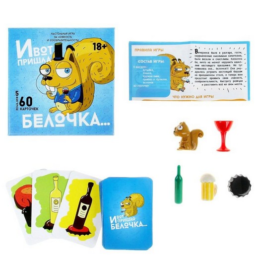 Настольная игра «И вот пришла белочка» это самое настоящее алкогольное пати только для взрослых! Игрокам предстоит хватать те самые предметы, которые будут изображены на вытягиваемых ими карточках. Среди предметов находятся игрушечные бокал вина, кружка пива, бутылка алкоголя, которые игроки смогут легко заменить на настоящие, оставив только фигурку белочки. В этом случае вечеринка станет еще азартней и отвязней!