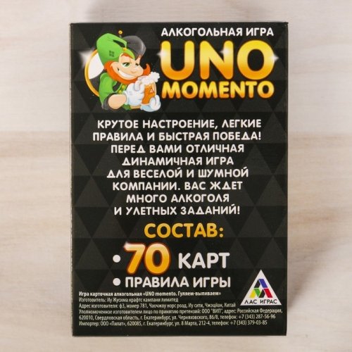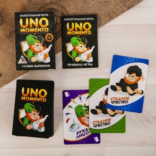 Собираетесь большой компанией? Тогда настольная игра "UNO momento 18" идеально вам подходит! Развлекайтесь, соревнуйтесь и получайте удовольствие. Ведь вас ждёт удивительная игра, которая проходит весело, азартно и каждый раз по-новому! Вас ждет много алкоголя и улетных заданий!