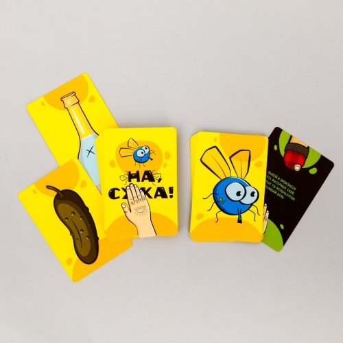 Точно, в игре ещё есть карточки с надоедливой мухой и фантами. Если один из игроков вытянул эту карту, то все участники должны как можно быстрее хлопнуть ладошкой по колоде, громко выкрикнув при этом название игры.