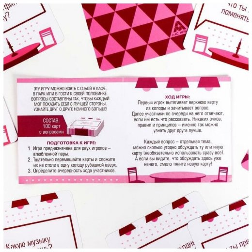 По очереди вытягивайте карты из колоды и зачитывайте вопрос. Далее по очереди на него отвечайте. Никаких очков, соревнований и определения победителей. Просто карты для развития диалога и сближения.