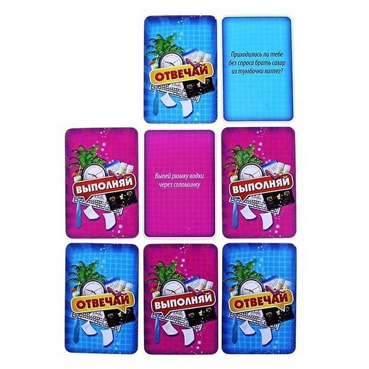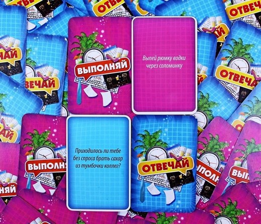 Один из участников задает вопрос: «Отвечай или выполняй?», получает соответствующий ответ от коллег и тянет карточку из указанной колоды. 1) Карточки «Отвечай» - это вопросы различного характера, которые так или иначе связаны с работой и коллективом, например: «С каким алкогольным напитком можно сравнить ваш коллектив?». 2) Карточки «Выполняй» - веселые задания-фанты, алкогольные, пикантные и просто веселые.