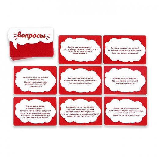 В набор входят карточки, которые нужно крепить на лоб, либо просто прислонять к нему. Содержание карты будет видно окружающим, но не участнику. Задавайте друг другу самые нелепые вопросы и отвечайте на них наугад.