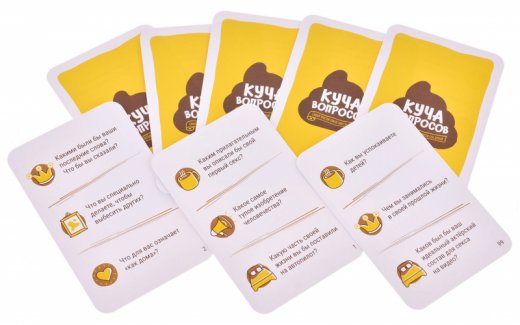 "Куча вопросов" – это настольная игра для шумных (и не очень) компаний, в которой даже самый "тупой" ответ способен привести вас к победе! Каждый ход игроки по очереди становятся ведущим, его роль состоит в том, чтобы взять карточку и зачитать с неё любой из трёх вопросов. У ведущего есть 2 ширмы, "умная" и "тупая", которые спрятаны коробкой от игры. Игроки по очереди отвечают на вопрос, а ведущий сам решает, был ответ "умным" или "тупым", и тайно кладёт жетон игрока в соответствующую ширму. Тот, кто последним отвечал на вопрос, выбирает, какую ширму вскрыть: те игроки, чьи жетоны оказались открыты, передвигаются вперёд по игровому полю. Побеждают те, кто первым доберётся до конца!