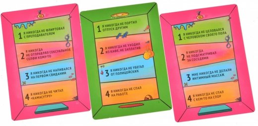 Тем более, что правила простые как пять копеек – ведущий зачитывает любое утверждение на карте, а затем все участники, если они когда-нибудь делали то, что прочитал ведущий, выпивают. Ну а после все они по очереди рассказывают свои истории о том, как и почему произошло то или иное событие. Истории можно рассказывать в любом порядке и в любом объёме – главное чтобы все участники получали удовольствие от взаимного общения.