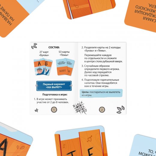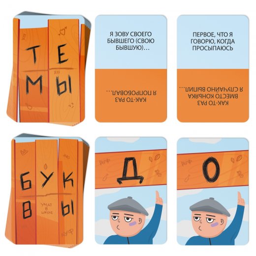 Вытягивайте карты из колоды «Темы», зачитывайте вопрос, а после открывайте верхнюю карту из колоды «Буквы». Задача каждого: в течение 3 секунд дать ответ (слово) на заданную букву и тему. Тот, кто получает штрафы – пьёт.