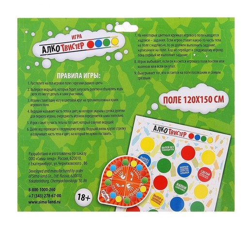 Когда намечается вечеринка и встает вопрос о том какую игру выбрать так, чтобы гости включились в ее процесс и не заскучали в итоге. Мы думаем, что "Твистер" это уникальное решение для самой крутой и веселой вечеринки, ведь именно он "сделает этот вечер"! Что может быть круче, чем азартные глаза ваших гостей, искренние улыбки и доброе стремление к победе! Настольная игра Алко Твистер это адаптированный вариант для вашей алкогольной пати, который делает времяпрепровождение еще круче, ведь тут есть штрафные рюмки, алкогольные испытания, и возможность пить и играть! Это игра на выносливость - кто больше выпьет и при этом устоит. Твистер еще веселее, когда это "Алко Твистер"!