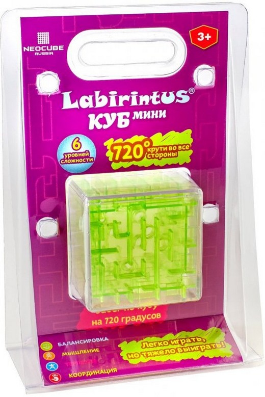 Лабиринтус Куб 6см зелёный прозрачный – это очень интересная и увлекательная игрушка. Цель игры-лабиринта – провести по прозрачному лабиринту металлический шарик, используя силу гравитации, но сделать это можно лишь, аккуратно наклоняя игрушку в нужные стороны.