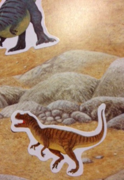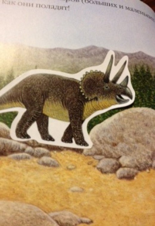 В книге есть развороты с интересной информацией о динозаврах. На некоторых таких страницах ребенку предлагается выполнить задания с помощью наклеек (наклеить наклейки с динозаврами на их черно-белые изображения). Также есть "пустые" страницы. На них нарисована только местность, которую ребенку предлагается "оживить" с помощью наклеек. В конце книги - викторина, предлагается 14 вопросов о динозаврах.