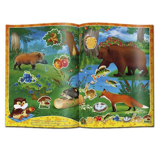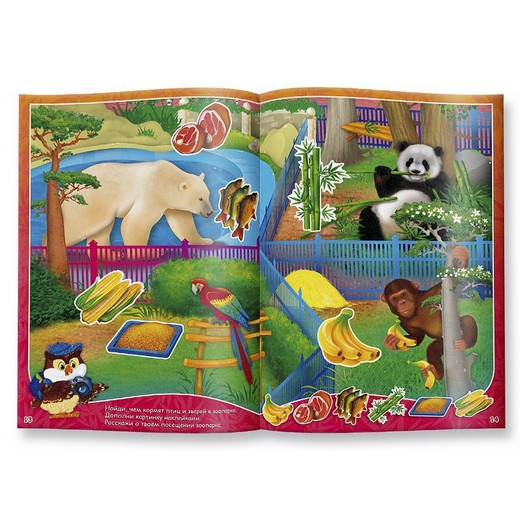 Кто что ест» — книжка с многоразовыми наклейками, призванная расширить кругозор ребенка и научить его устанавливать очевидные логические связи между событиями и предметами. Каждая страница книги – это игровое поле, на котором изображены животные и насекомые. Именно здесь малышу предстоит расположить их еду. Последняя представлена в виде многоразовых наклеек на заключительной странице книжки – ребенку необходимо будет приклеить «еду» на месте пробелов или рядом с животным. При этом дошкольник может ошибаться и повторять попытки отыскать правильный вариант снова, ведь наклейки легко отклеиваются и приклеиваются к игровому полю вновь. Вы можете разнообразить игровой процесс, попросив ребенка по памяти рассказать, чем питается каждое животное, а также пофантазировать и придумать, чем занимаются изображенные на картинке представители фауны.