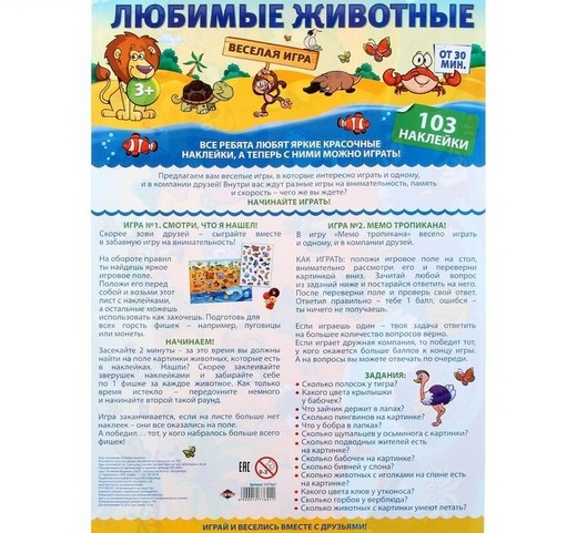 Внутри вы найдёте игровое поле с разными животными. Выбирайте одну из игр и приступайте к выполнению весёлых заданий, а наклейками вы можете украсить не только поле, но и творческие поделки, тетрадки, альбомы и многое другое.