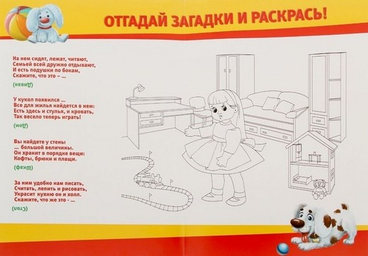 На обороте игрового поля вы найдёте интересную раскраску с загадками! Малышу предстоит угадать, о каком предмете мебели идёт речь в загадке и раскрасить его на картинке.