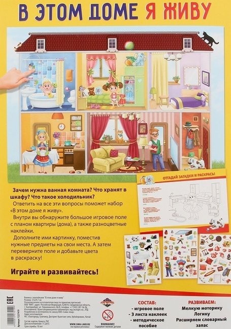 Перед вами волшебная книжка, в которой есть всё, что так любят дети! Внутри вы найдёте большую раскраску с загадками, игровое поле и 97 наклеек, с которыми можно играть! Этот набор будет способствовать развитию таких важных навыков, как: мелкая моторика, логическое мышление, внимательность и воображение, а также расширит словарный запас малыша. Набор «В этом доме я живу» подскажет малышу, какие комнаты есть в доме, чем они отличаются и зачем нужны. Внутри находится большое игровое поле с многоэтажным домом. Малышу предстоит украсить дом предметами интерьера с помощью наклеек. Стол окажется на кухне, а диван — в гостиной! Распределяя наклейки по полю, малыш запомнит названия предметов, которые есть в каждом доме. Все наклейки — многоразовые, их можно использовать снова и снова. Также в набор входит методическое пособие для родителей, которое подскажет, как с помощью интересных игр не только изучить, но и запомнить названия и функции комнат в доме.