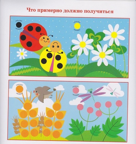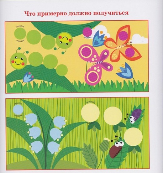 Первая педагогическая задача - моторика рук! Учим клеить кружочки разного размера, в разном количестве следующими способами: в точно определённые места и в свободной манере (выстраивая сюжет). Вторая задача - мышление. Подобрать цвет и размер, не ошибиться с количеством. Поэтому клеим и пересчитываем (если умеем)! За родителями - "разговор по теме" - лес, луг, огород и т.д. Издание развивающего обучения для детей дошкольного возраста.