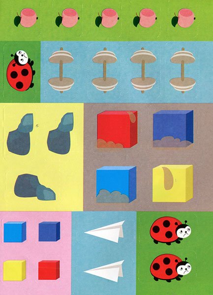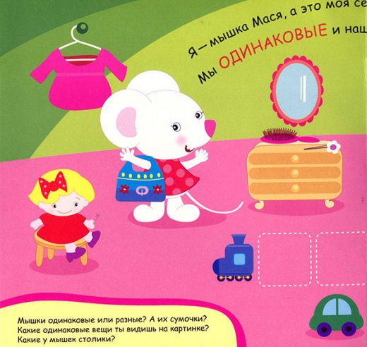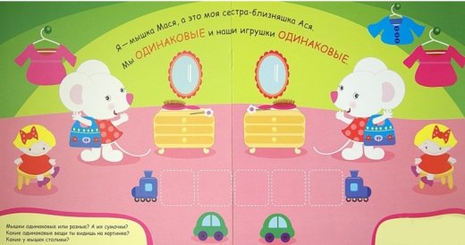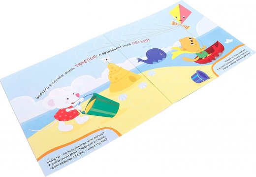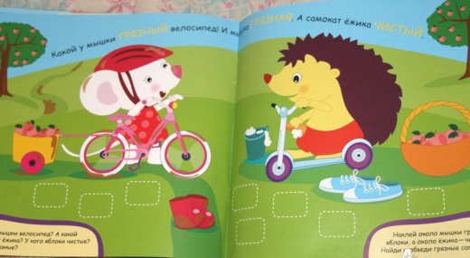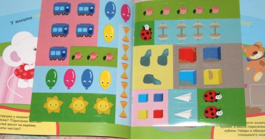Например, нужно найти и приклеить на свои места легкие бантики и тяжелые камешки; возле мышки - чистые кубики, а возле поросенка - грязные; веселые цветы и грустных божьих коровок. Доступные обучающие задания и яркие иллюстрации обязательно понравятся ребенку и надолго увлекут его.
