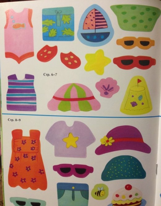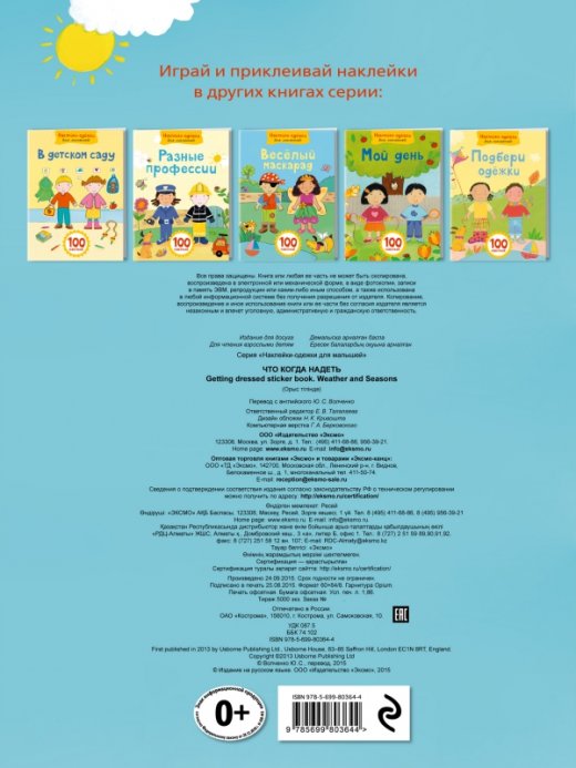 Наклейки одежки Что когда надеть – это замечательный подарок для юного модельера или модельерши. Эта замечательная книга в игровой форме откроет ребенку тайны одежды и поможет ему справиться с трудными ситуациями. А именно научит его выбирать одежду по погоде, приводя пример на детях, которых и нужно будет одевать, по ходу игры с набором.