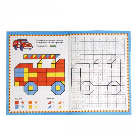 Умная мозаика 1000 наклеек "Машинки" - это увлекательная книга-игра и одновременно развивающая раскраска. Собираем картинки транспорта из геометрических наклеек вместе с малышом и раскрашиваем. На контурных формах есть звездочки и крестики определенных цветов, которые показывают, какой тип наклейки надо нанести на основу. Кружочки обозначают, что данную зону можно раскрасить цветными карандашами.