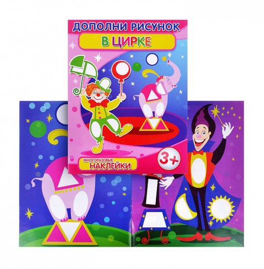 Купить книга с наклейками Дополни рисунок "В цирке" в Новосибирске Вы можете в магазине развивающих и настольных игр "Игры Почемучек".