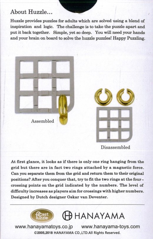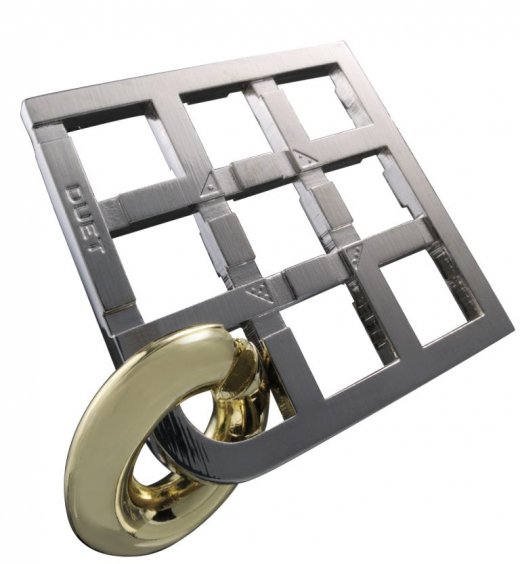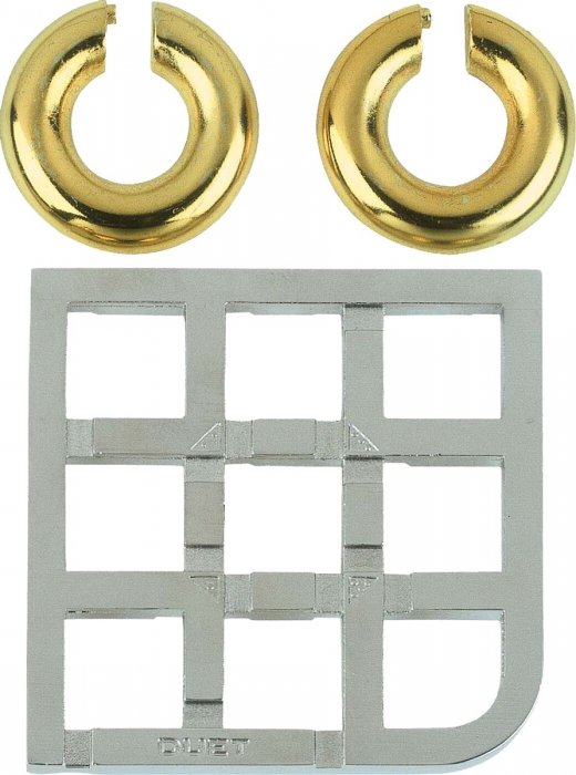 Головоломка Дуэт***** Huzzle - интересный и занимательный подарок для юного интеллектуала. Она отлично подойдет как для взрослого, так и для ребенка. На первый взгляд кажется, что на решетке висит только одно кольцо. На самом деле здесь два кольца, соединенных магнитной силой. Вы можете снять кольца с решетки, а затем вернуть их в первоначальное положение? Когда у Вас это получится, попробуйте еще разместить два кольца в четырех углах решетки, обозначенных метками. Чем больше номер метки, тем выше уровень сложности. Это очень интересная металлическая головоломка, включающая в себя несколько задач, подлежащих решению.