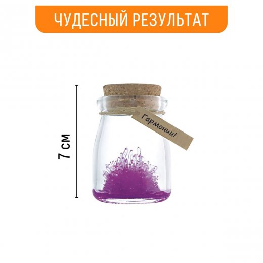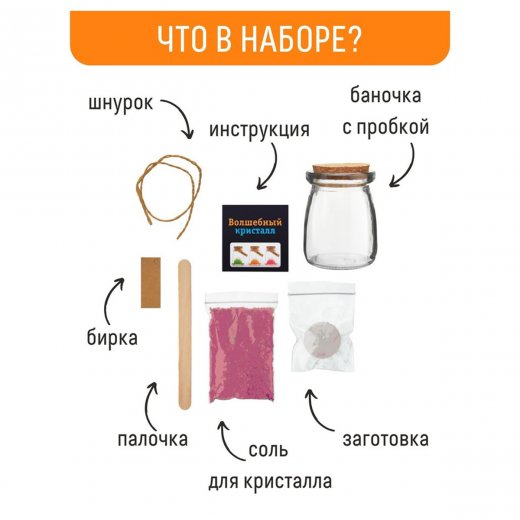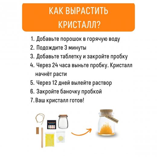 В комплекте: баночка с пробкой, кристаллический порошок, кристаллическая таблетка, палочка для перемешивания, веревка, бирка с пожеланием, инструкция на русском языке