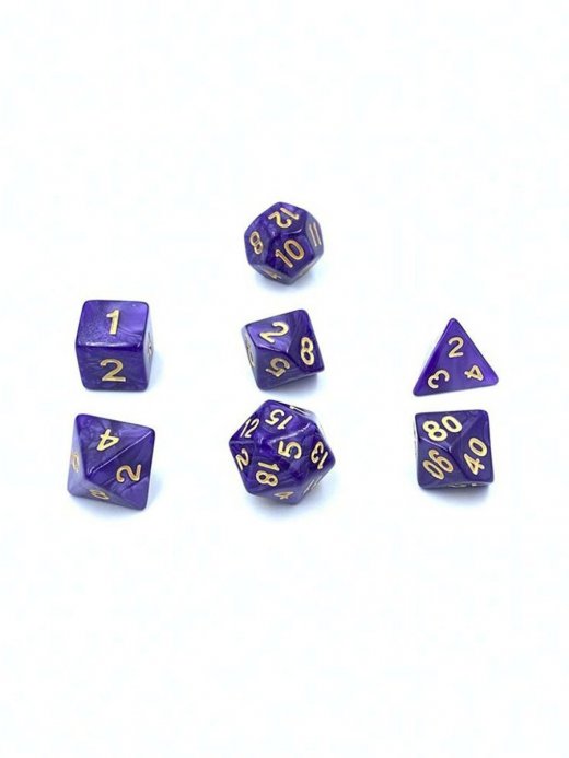 У каждого игрока должен быть свой набор дайсов (кубиков, игральных костей). В этом наборе есть все семь дайсов, которые понадобятся в классических настольных ролевых играх, таких как D&D, Pathfinder, Starfinder и других: d4 (четырёхгранный), d6 (шестигранный), d8 (восьмигранный), d10 (десятигранный), d12 (двенадцатигранный), d20 (двадцатигранный), d100 (процентная кость).