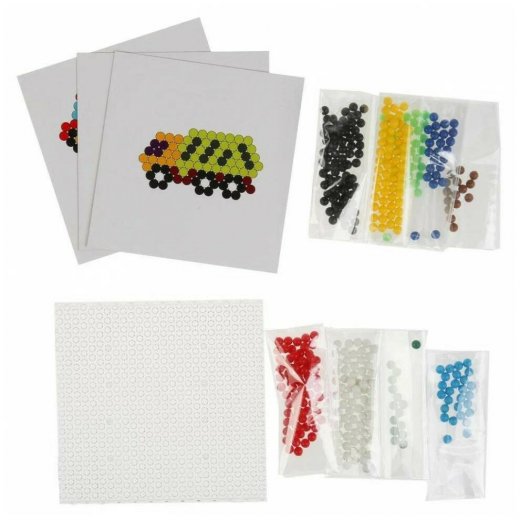 Пластиковая основа, цветные бусины, карточки-шаблоны, распылитель для воды, пинцет, яркие цвета, инструкция на обороте упаковки.