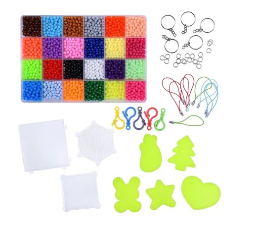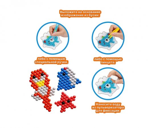 В набор входит:- бокс для бусин.- пластиковая основа 8 шт.- цветные бусины 2400 шт (24 цвета).- распылитель для воды 1 шт.- пинцет 2 шт.- ручка для бусин.- подвес.- кольцо 8 шт. Материал: полимерные материалы, картон. Соответствует требованиям безопасности продукции. Для детей от 6 лет.