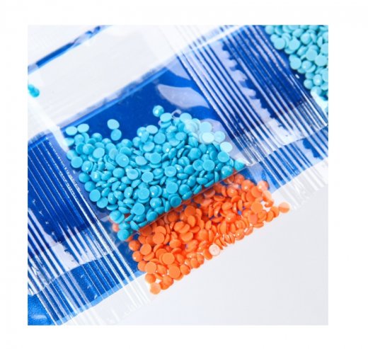 - Из пакетика с номером, который соответствует схеме, отсыпьте в ёмкость немного стразов.