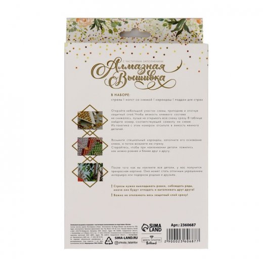Часть картины предстоит заполнить стразами, другая часть напечатана на самом холсте — такое изделие легче и быстрее создать. Поэтому набор такого небольшого формата подойдёт для тех, кто впервые пробует свои силы в этой технике или любит быстро добиваться результата.