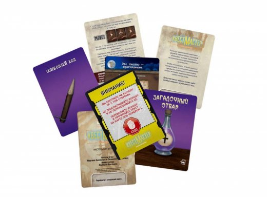 В состав настольной игры «КвестМастер: Замок Дракулы» входят: 64 карты, одна загадочная книга.