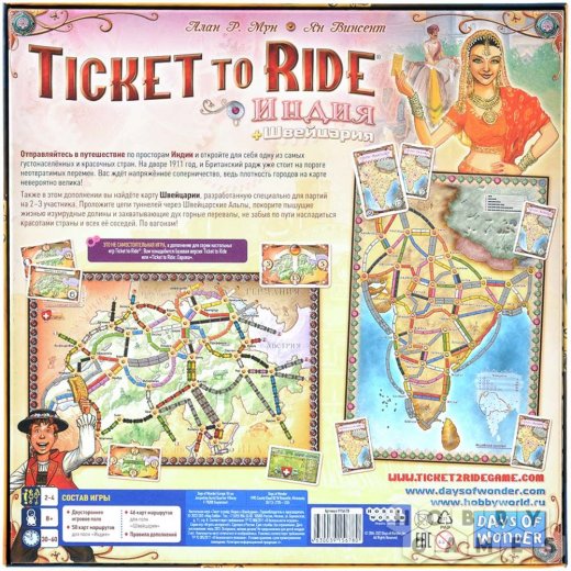 О дополненииВ состав "Ticket to Ride: Индия и Швейцария" входит новое двухстороннее игровое поле. Как можно понять из названия, одна из сторон поля представляет собой карту Индии, а другая – карту Швейцарии. В Индии вас ожидают партии с высоким уровнем конкуренции за перегоны между городами, а также за паромы – особые перегоны, соединяющие города по воде. Будьте хитрее остальных игроков, чтобы достичь своей цели и постарайтесь организовать "Великие туры" по Индии!