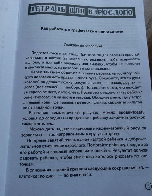 Обратите внимание: тетрадь состоит из двух частей (в каждой по 16 страниц). В одной части (с. 1-16) ребенок будет выполнять задания, а другая (с. 1-16) нужна взрослому, чтобы диктовать последовательность работы и проверять, правильно ли выполняется задание. Перед началом занятия раскройте скобки в середине тетради, извлеките адресованные взрослому страницы, вновь скрепите оставшуюся часть и отдайте ребенку.