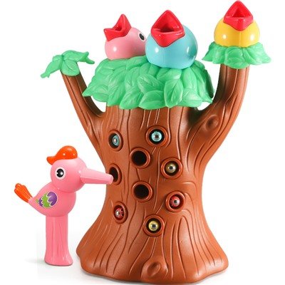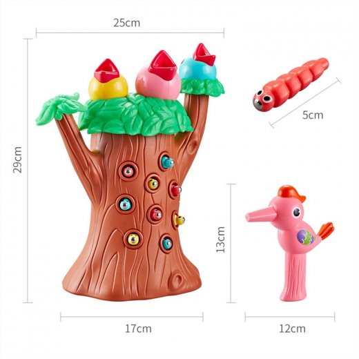 Каждый червячок, что спрятался внутрь, имеет магнит и спрятан в ствол дерева. У птички на клюве тоже магнитная основа, с помощью которой можно вытянуть червячка.