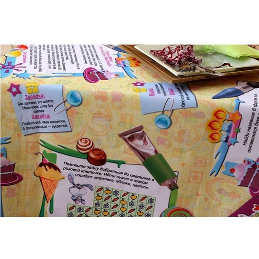 Ведь это так здорово, когда на праздничном столе постелена скатерть, на которой можно рисовать, проходить по лабиринту, отгадывать загадки, выполнять озорные фанты!