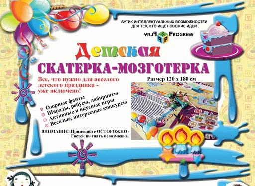 «Скатерка - мозготерка детская» это необычная настольная игра, в которой содержится множество полноценных игр. Здесь и фанты, и шарады, и ребусы, и лабиринты. Вкусные игры, конкурсы. Ребятишки не соскучатся!