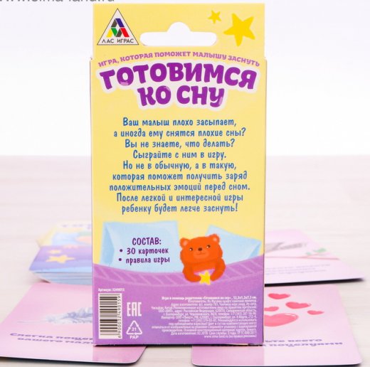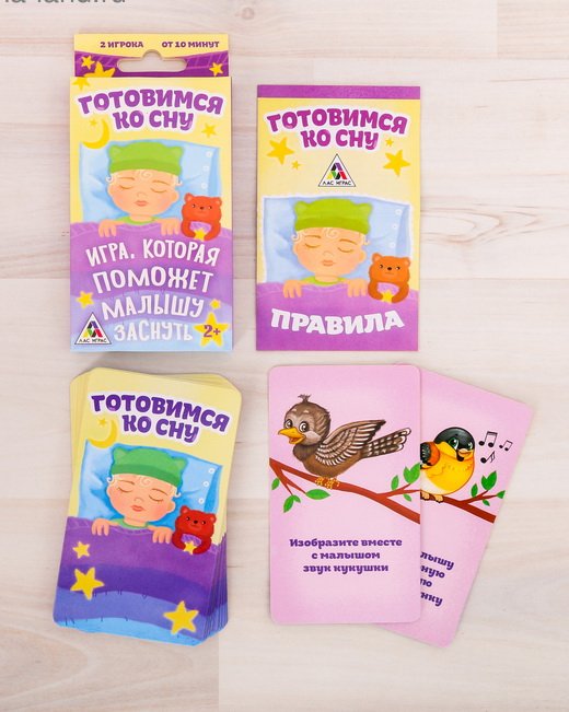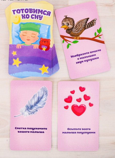 Также в наборе есть особые карточки, которые помогут заснуть не только ребёнку, но и его любимой мягкой игрушке. Ведь уложив игрушку, малыш непременно сам захочет спать!