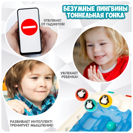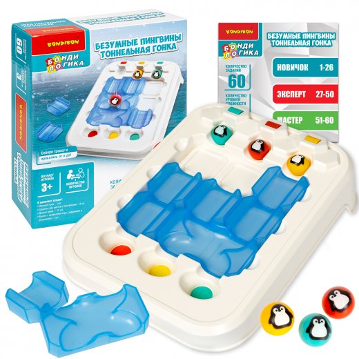 В комплекте: игровое поле, шарики трех цветов с пингвинами, 12 деталей трека, буклет.3 уровня сложности