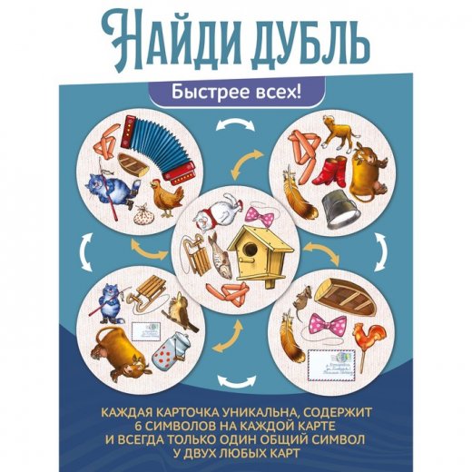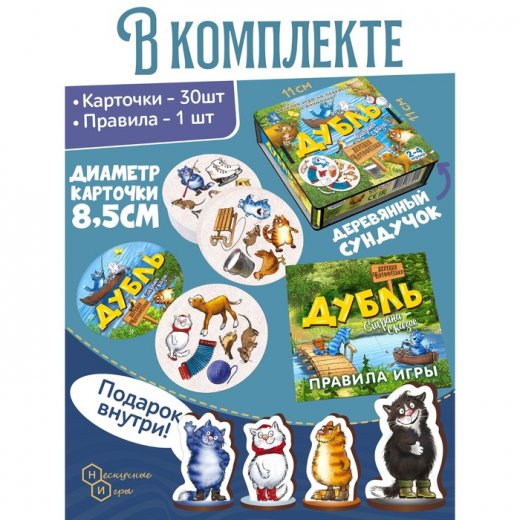 Настольная игра ДУБЛЬ Деревня Котофеевка с иллюстрациями от автора Рина Зенюк. Дубль Страна сказок Деревня Котофеевка 6 игр в 1 - Прояви свою внимательность и реакцию в мини-играх. Цель игры находить один общий предмет на двух разных кругах. В состав игры входит 30 круглых карточек, на каждой из которых размещено 6 рисунков, правила игры и Подарок (деревянные фигурки персонажей!) При этом на двух любых карточках всегда есть только один общий рисунок. Авторами игры предлагается 6 разных игр, которые описаны в брошюре. Принцип в них одинаковый, нужно быстрее других находить одинаковые картинки на открытых карточках. Игра тренирует внимательность и скорость реакции. Она будет интересна и детям и взрослым. Карточки выполнены из достаточно плотного картона.
