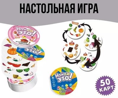 Развивающая настольная игра - Найди это! В эту игру можно играть в компании детей или с родителями. Выберите одни правила из девяти или начинайте по порядку. В каждой игре потребуется быстрая реакция в поиске одинаковых изображений на картах. Также, в новой серии игр можно найти больше интересных тем как, динозавры, животные и многое другое. Собирайте серии и устраивайте турниры с разными видами карт! Игра развивает визуальное восприятие, реакцию и точно создаст веселое времяпровождение в семейный вечер.