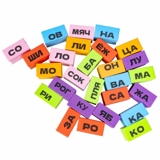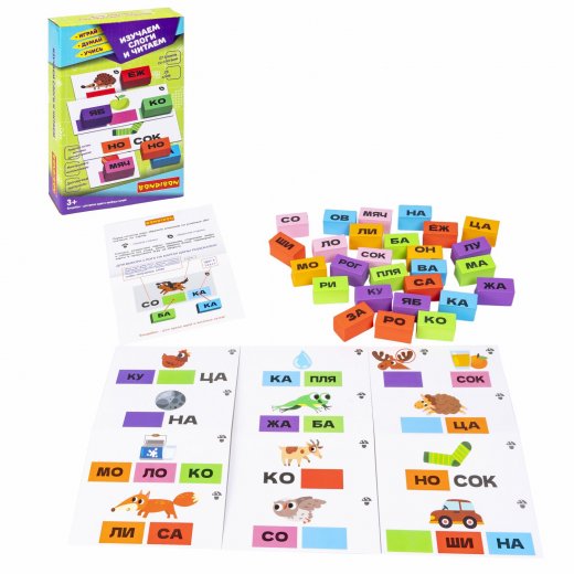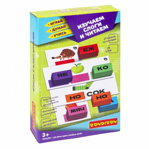 В комплект игры входят: 27 объемных блоков со слогами из легкого, но прочного материала EVA, 13 двусторонних карт для создания 26 слов, инструкция. Рекомендуемый возраст 3+ Соберите всю серию развивающих игр для детей Играй Думай Учись от Бондибон!